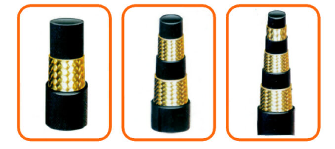 高壓鋼絲編織膠管結(jié)構(gòu)是由耐液體的合成膠管內(nèi)膠層、中膠層、Ⅰ或Ⅱ?qū)踊颌髮愉摻z編織增強層及耐氣候性能優(yōu)良的合成橡膠外膠層組成。